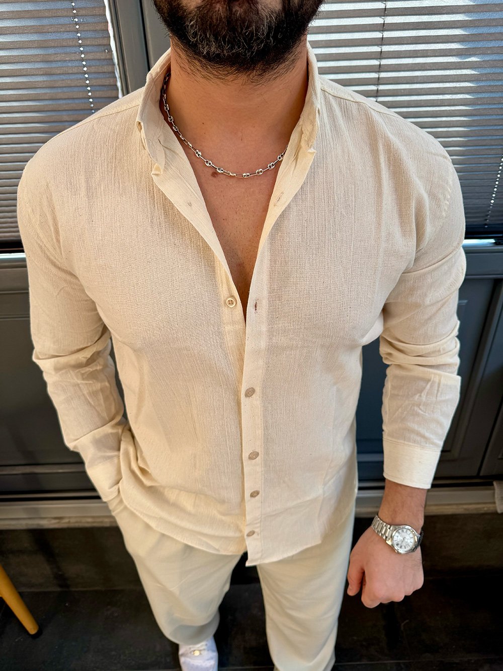 Yeni Sezon Rahat Kalıp Krinkıl Krem Gömlek