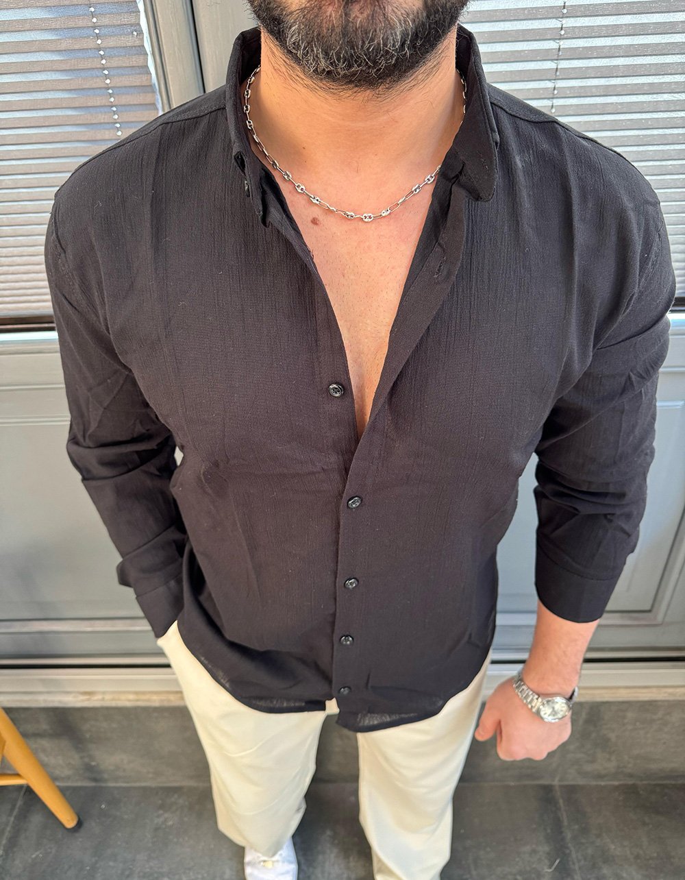 Yeni Sezon Rahat Kalıp Krinkıl Siyah Gömlek